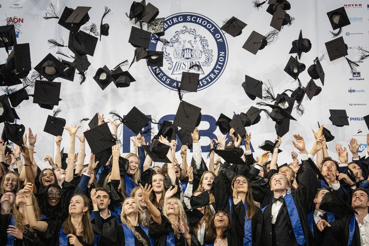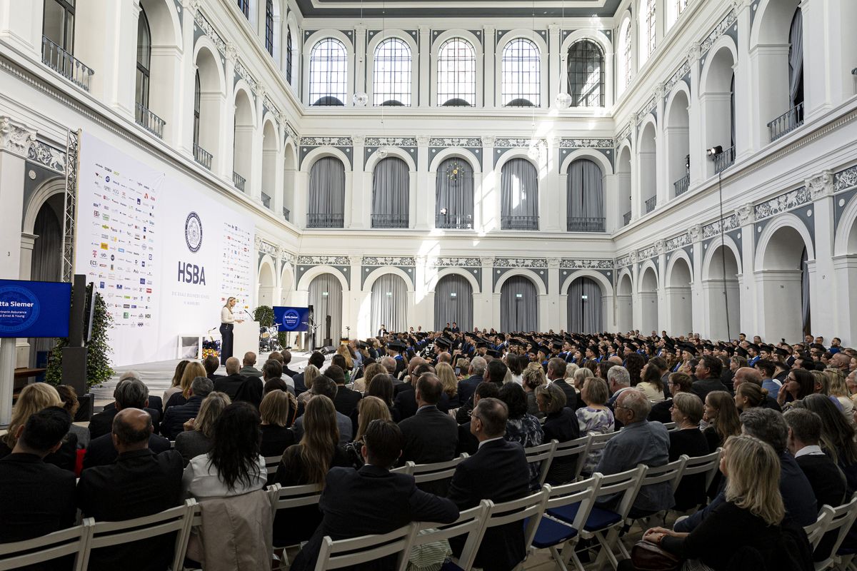 Die Graduierungsfeier ist ein bedeutendes Ereignis im Leben unserer Studierenden und zählt zu den wichtigsten Feierlichkeiten an der HSBA. Die diesjährige Abschlussfeier fand wie im Jahr zuvor wieder im lichtdurchfluteten Börsensaal der Handelskammer Hamburg statt, der mit seiner imposanten Architektur den passenden Rahmen bildete und den Moment unvergesslich machte. Insgesamt erhielten 191 Bachelor- und knapp 30 Master-Studierende sowie zwei Doktoranden, ausgestattet mit Talar, Schärpe und Barett, ihre wohlverdienten Abschlusszeugnisse und stießen im Anschluss mit Familie und Freunden auf ihre Zukunft an.
